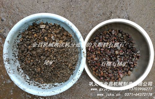 因為石榴石的比重較大,而脈石的比重較小,兩者有很明顯的比重差,跳汰機正是根據(jù)物體比重差進(jìn)行分選的設(shè)備,效果是很不錯的。下邊圖片是鞏義市金昌機械用跳汰機分選出的石榴石效果,您可以參考一下。